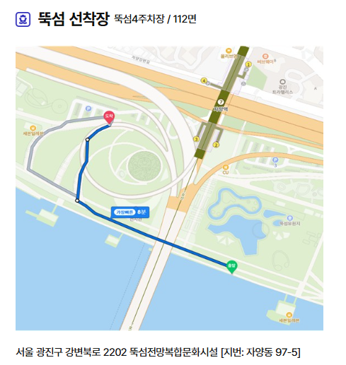💡 뚝섬은 주차장에서 선착장까지 도보 1~2분 거리로 매우 가까워요!