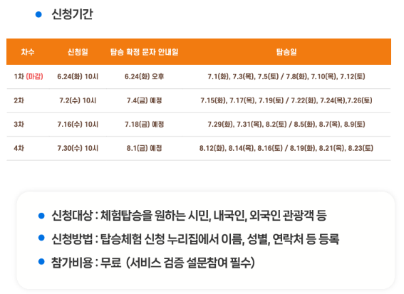 | 차수 | 신청일 (10시) | 문자 안내일 | 탑승일 |