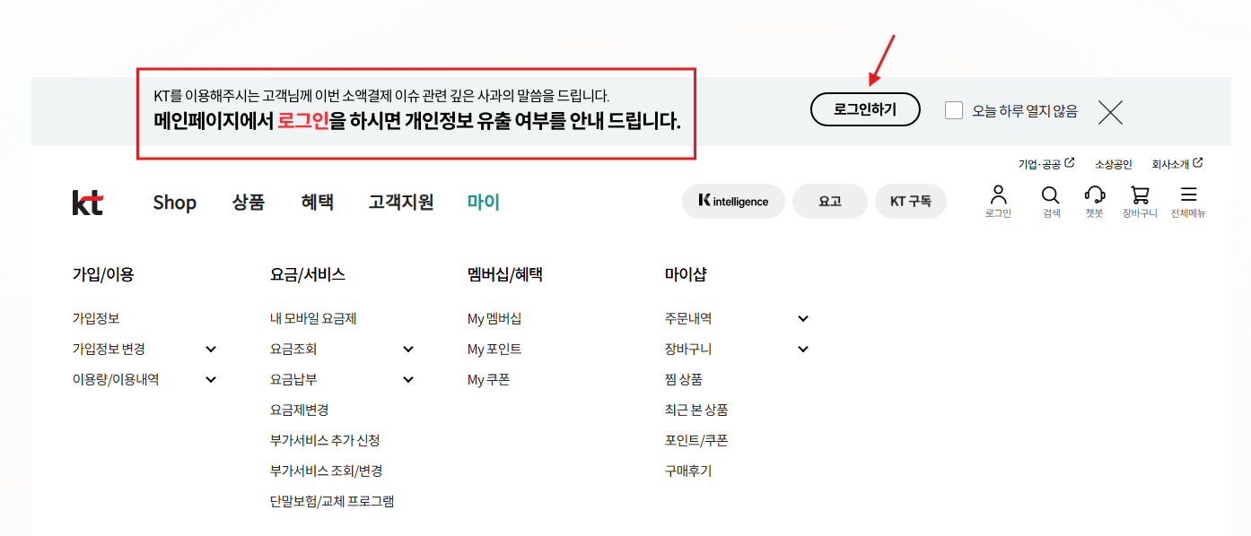 - 경로: KT 홈페이지 → 개인정보 이용·제공 내역 조회